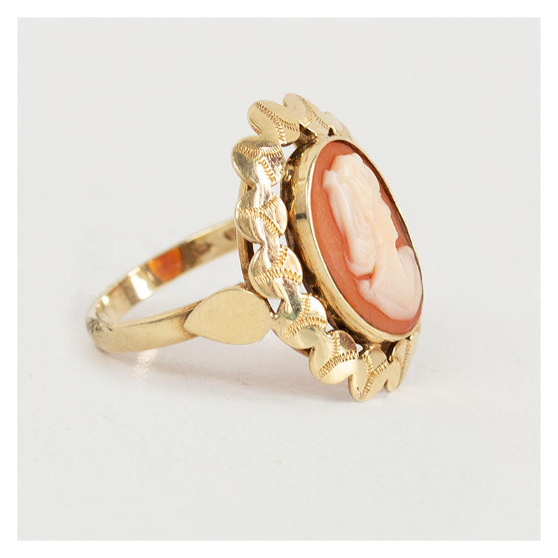 Gouden camee ring met maat 17. Omrand met een gouden blaadjes.