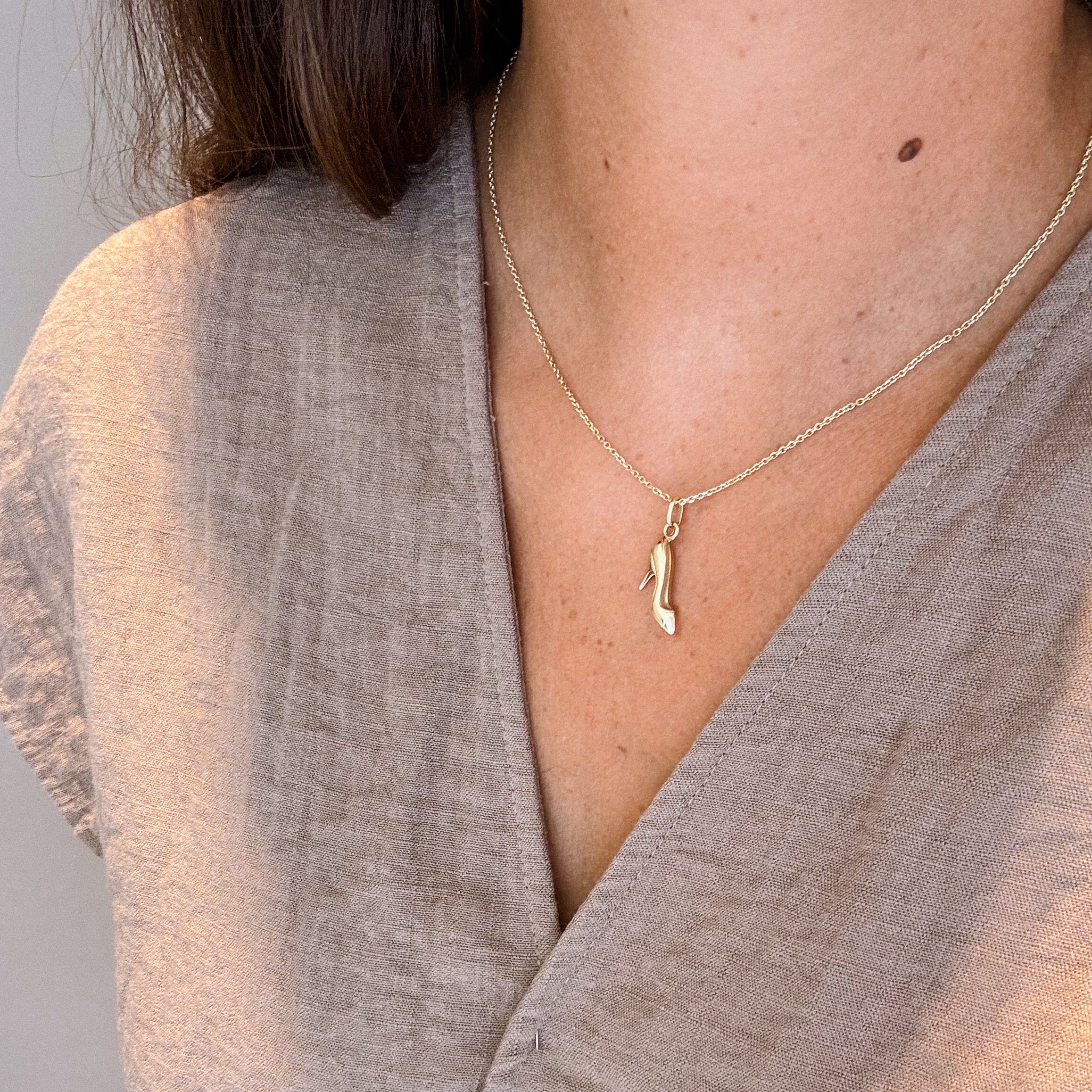 Nooit lang op hakken kunnen lopen? Draag 'm dan lekker om je nek! En deze hanger is ook nog eens gemaakt van 14 karaat goud, 2cm lang en oneindig te dragen.
