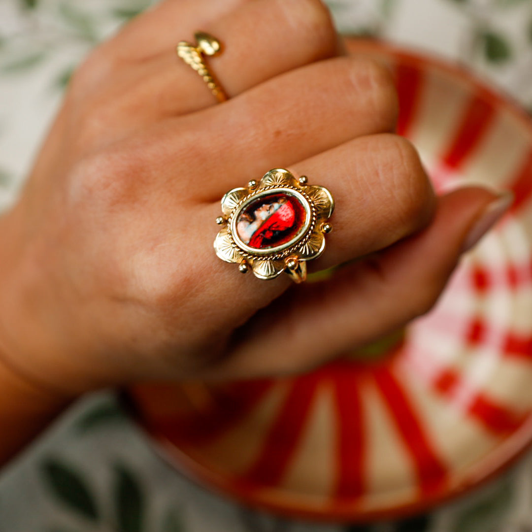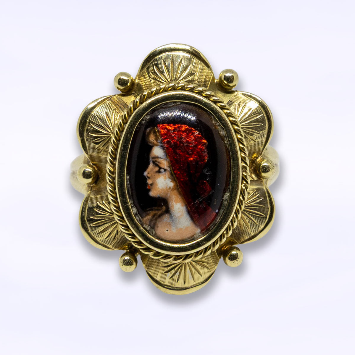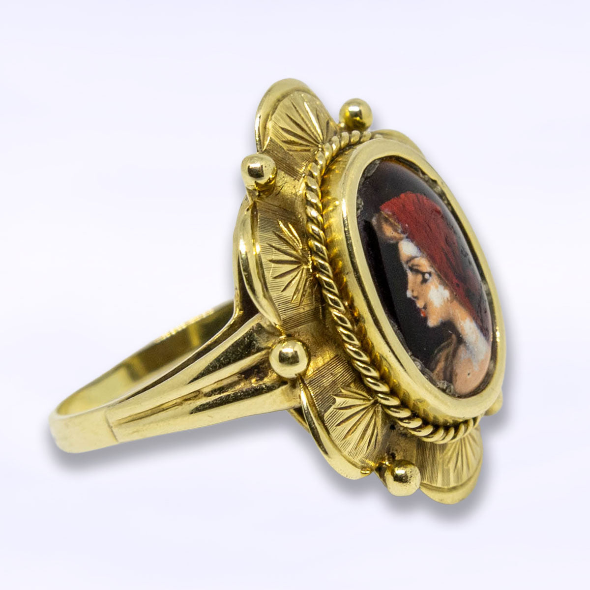 Een 14 karaat limoges emaille ring met golvende versiering eromheen. This girl is alles wat je om je vinger wilt dragen. Maat 18,25