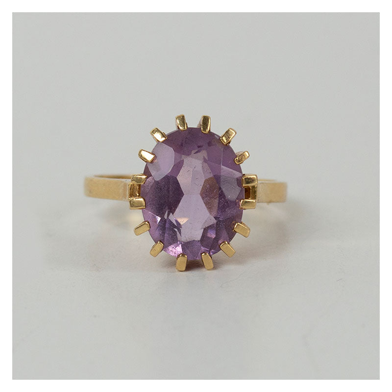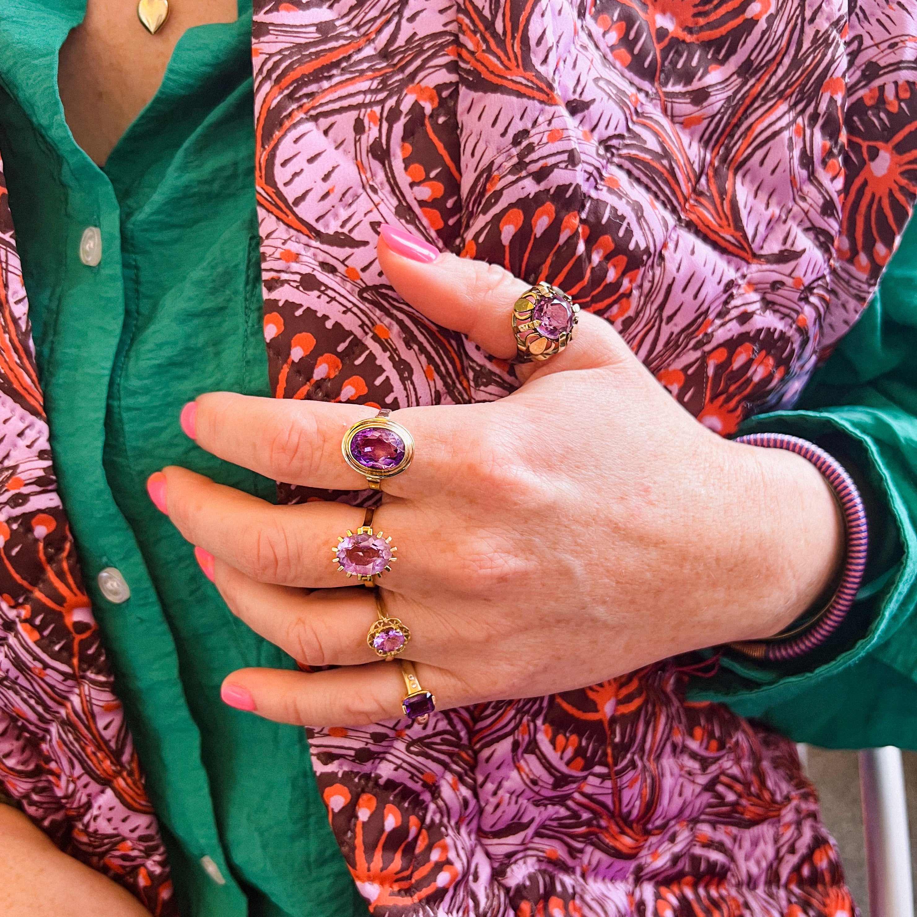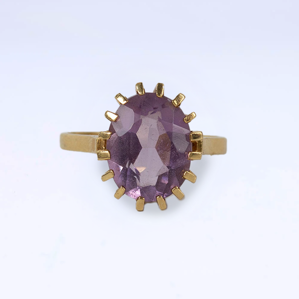 Vintage ring met een paarse edelsteen, gemaakt van 18 karaat goud.