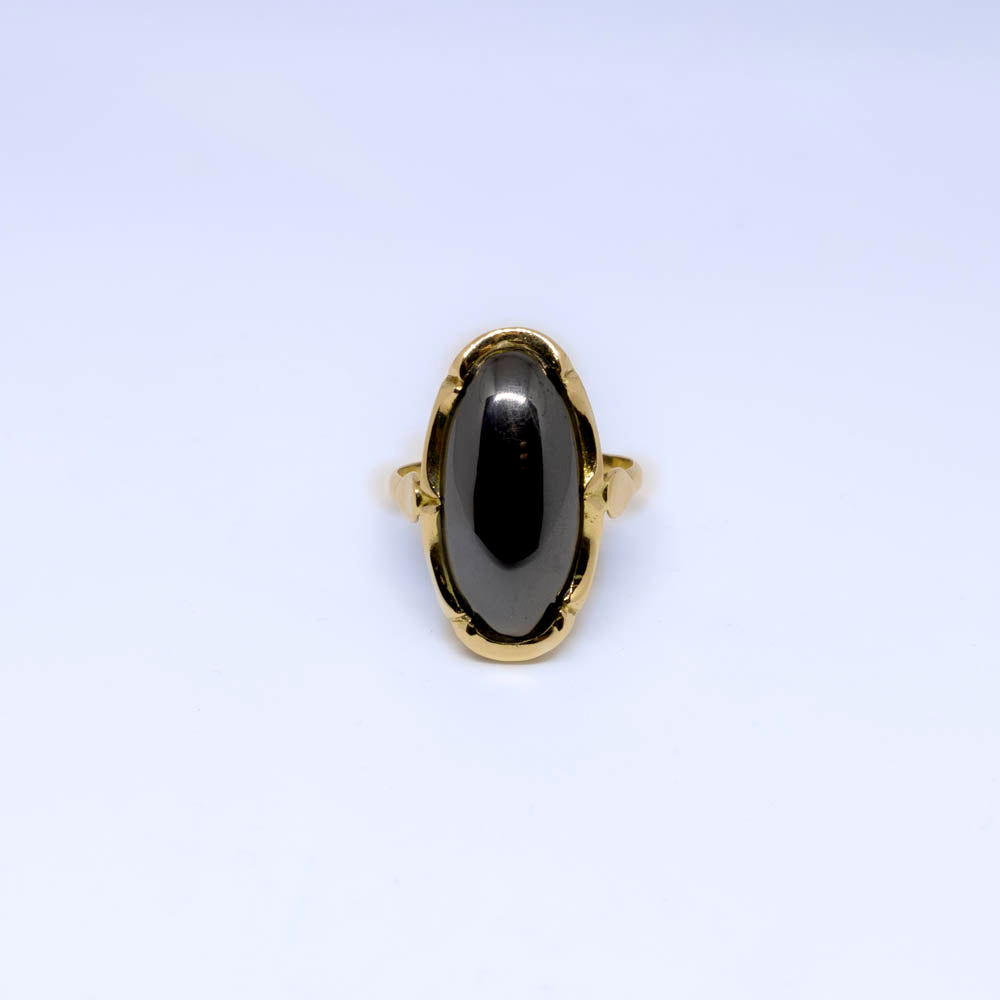 Deze vintage ring heeft een stoer randje. De ovale, gladgepolijste hematiet ligt stevig in een 14 karaat gouden zetting. In maat 18 met de optie om 'm te laten vermaken van 16-20 bij een goudsmid in de buurt (echt easy peasy).