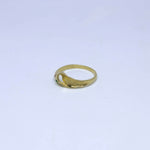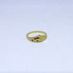 Een vintage ring van 8 karaat goud met een opvallend design: drie kleine steentjes – saffier, smaragd en robijn, een open midden en een omgevouwen lus als detail.